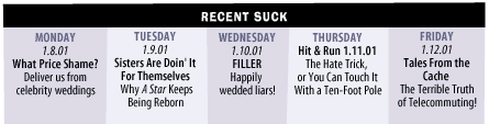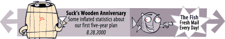 You may not know it to look at us now, but there was a time when Suck was the Belle of the Web's first, hopeful, money-soaked ball. Gentlemen callers lined up to compliment us on the elegant simplicity of our snake-text page design. Handsome suitors held out generous offers for our hand in marriage. Future allies wrote credibility-straining prose poems about the unique argot of Suck's house style. Like most early paeans to the brave new online world, this one had about as much basis in truth as a Blanche DuBois reverie. To the extent that Suck ever seemed innovative, it was less a measure of the founders' brilliance than of a Content Kingdom so lamebrained that formal effects like black-on-white type, daily updating, an easily remembered URL, reader mail, and funny links seemed like strokes of immeasurable genius. Hard as it may be to believe, all this was hot, new, bold and exciting stuff when Suck rolled it out. But heroes last a few days; goats linger forever. Suck's long, slow slide from microstardom to obscurity has been marked by many indignities: Erstwhile butts of Suck japery now update around the clock, while we cling to our old one-a-day ways like officers in the Polish cavalry. Kids who were still in plastic pants when Suck was created have built effective interactive sites while Suck's sole contact with its readers remains the sadomasochistic Fish page. Even the snake text had to go once we received our one-millionth email that began, "This looked like an interesting article, but I'll never know because I couldn't read your fucked up layout." We're saying all this not for the joy of self-pity (at least, not entirely), but because there's news. Five and a half years down the road, you may hate Suck as much as ever, but you no longer have to take it lying down. In honor of Dr. Martin Luther King's birthday, we're proud to announce Plastic, the community built by our corporate overlords (and several Sucksters who pray fervently that lightning might strike twice). Updated by the minute, using the Navy's atomic clock for accuracy, Plastic ensures that the Sucksters will never again have control over the flow of information. Not since the fall of Ceaucescu have the enemies of freedom been in such headlong retreat. From now on, we won't be publishing our lazy screeds and then throwing out the hate mail. We'll be publishing our lazy screeds and then watching you rip us to shreds in public. Pessimists (or for that matter, optimists) might say that this kind of disintermediation will show how irrelevant the Sucksters were all along. We prefer to look forward to the invigorating prospect of going post-for-post with you, the Fabulous Little People. Who knows maybe being forced to get down in the gutter with every potty-mouthed slob in a "No Fat Chicks" t-shirt will bring out reserves of strength and inventiveness that we effete and toffee-nosed Sucksters didn't know we had. Or maybe it all won't mean anything at all. Prophecy was given to fools, but Plastic is being given to you. So go there and speak your mind. From now on, you have nobody to blame but yourself. nor is it a smoking gun. Discuss. courtesy of BarTel d'Arcy pictures Terry Colon |