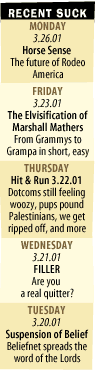 If watching an Academy Awards ceremony is enough to fill every decent American with a dull sense of embarrassment, how are we to treat the exquisite, burning sensation of shame that accompanies the act of watching trailers in a darkened movie house? After all, the Oscars are just a show that happens to be on your TV. Movie trailers are amped-up, painstakingly crafted proofs of your own stupidity, insistent reminders that you actually paid money to put yourself at the mercy of America's entertainment industry. That sense of humiliation you feel when watching a movie trailer is more than just empathetic embarrassment for all of humanity. It's a specific, personal type of chagrin which comes from realizing that this is entertainment people think you might be interested in, and that your purchase of a nine-dollar ticket for Heartbreakers has given them good reason to believe that. No tenth-year viewer of Cats has ever known such shame. But look on the bright side. If the trailers more often than not make you hate the very art form they're advertising, can that be a bad thing? Isn't there some Consumer Reports-style value in being able to read the movie tropes that will encourage you to stay home? If you haven't already made a resolution not to see any movie where people run along walls, don't worry a few trailers from now you'll have changed your mind. What's a more useful tip to avoid a movie than a wide-eyed Matthew Perry doubletake or a "We're not in Kansas anymore" pullquote in the trailer? You should feel relief when the appearance in a trailer of Ben Affleck or Bill Paxton (the poor man's Bill Pullman by even the most generous measure) all but announces that you will be able to save a few more bucks. As a public service, here are ten warning signs that will spare you from having to pay tribute to Hollywood. If you see any of these in a trailer, you can safely avoid the movie. You are of course, more than invited to return the favor by adding some warning signs of your own :