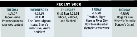 ![]() The exposure of this fiction, even more than sheer boredom or the snooterati's irrational antipathy toward Tom Cruise, may have been behind the cool box office reception of Stanley Kubrick's Eyes Wide Shut, a film whose centerpiece was a crypto-religious sexual ritual that in the end featured nothing spicier than some run-of-the-mill penetration. Where was the mortification of the flesh? The casual snuff? The interspecies coupling? Were we really supposed to believe that a bunch of Bohemian Grove gazillionaires would go to all this trouble for an orgy not much more perverse than something the Knights of Columbus might pull off on a spouse-free weekend? The more disturbing possibility is that Kubrick was accurate, that this about as outrageous as it gets in the world of shadowy brotherhoods. Being limited only by your imagination often means being pretty limited indeed. Any reader of Charles Portis's Masters of Atlantis has already been hipped to the shocking truth: There's a vacuum at the heart of hooded fraternities. Masons, Anti-Masons, Illuminati, Maltese brotherhoods, Mystic Knights of the Oingo Boingo: In the end, it's all a great sitting around, all foreplay and precious little in-out. The inefficacy of hermetic brotherhoods is nowhere better demonstrated than in anti-trade-conference street theater. It's the anti-capitalist rabble who demonstrate, again and again and again, their superior organizing capabilities, and the outfoxed masters of the smoke-filled rooms who are left to whine about the breakdown in civility. In his report on the Skulls, Rosenbaum continually hammers home the point that the participants in these juvenile hazing rituals routinely go on to important jobs involving national security. It's a game effort to establish the newsworthiness of spying on a bunch of spoiled Yale pricks, but again, where is the surprise that these Old Boys would want to get into the global intrigue business? Other than international gamesmanship, what field can compare to fraternity bonding for sheer meaningless pomp and lack of real-world application? The Soviets routinely beat the West at intelligence gathering, and look where it got them. The World War II Germans were able to spring many nasty surprises on the Allies long after their super-double-secret code had been broken. All the way back to Cassandra, intelligence gathering has been a questionable resource in international power struggles. This is why Hanssen makes such a perfectly pathetic model for the intelligence business. In the end, says MSNBC, "Hanssen's obsessions with religion and communism" even drove away his friend Bamford.