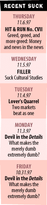 The Suck School of Comic Art is not a correspondence school. Please do not send sketches or drawings, no matter how funny, to Suck. We will not review them, grade them, or render advice of any kind. All unsolicited material becomes the property of Suck, and we reserve the right to steal any idea from them as we please.